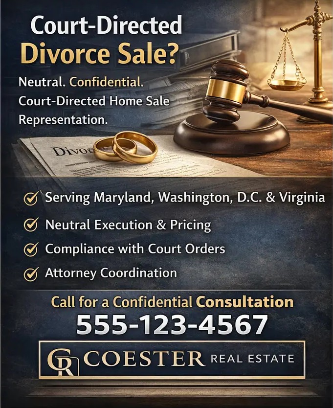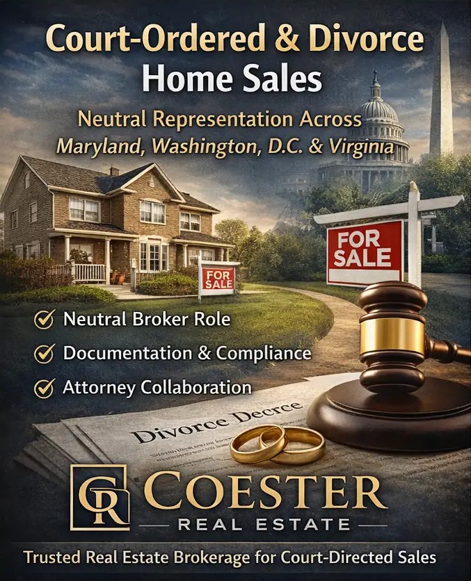 Coester Real Estate serves clients across Maryland, Washington, D.C., and Virginia, working alongside family law attorneys, title companies, and settlement professionals to complete court-directed transactions smoothly and professionally.